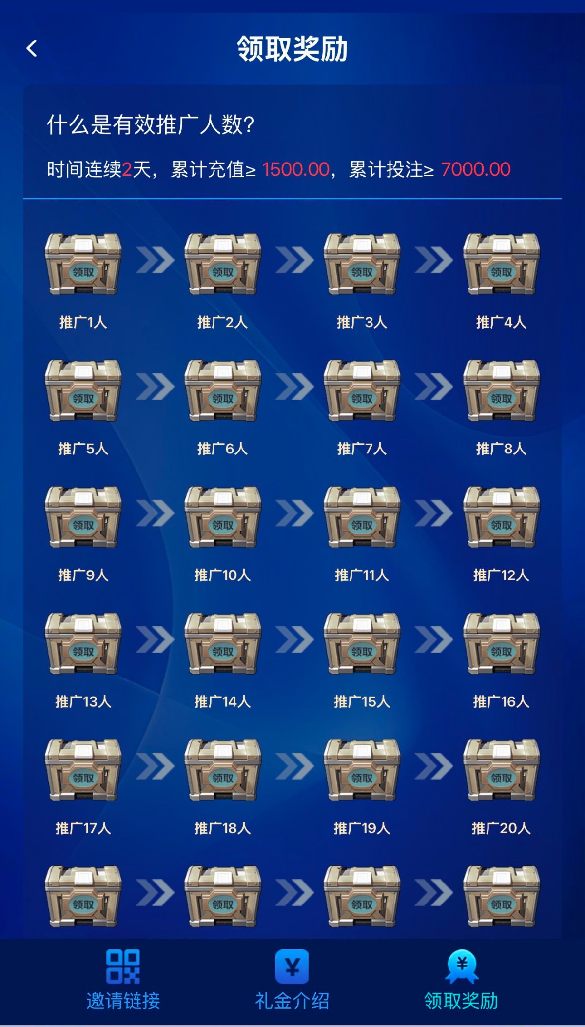 拉一个人500 前往 APP大厅下方“我的”→邀请好友→“礼金介绍”查看了解